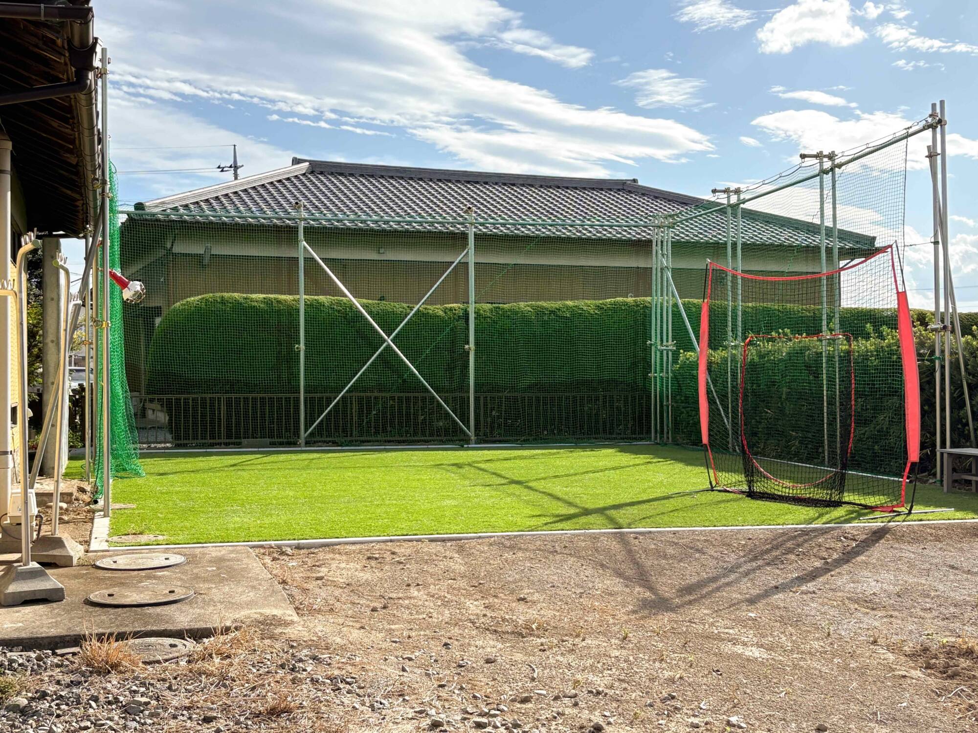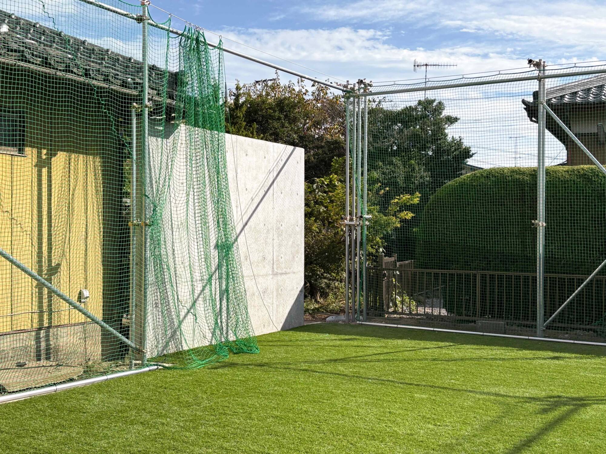 防球ネットとコンクリート壁に囲まれた人工芝の練習スペース。周囲への飛球をしっかりガードし、自宅でも安心して投球やキック練習が行えます。